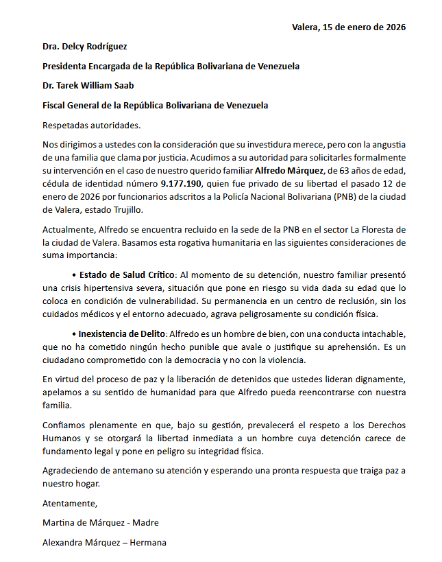 Familiares de Alfredo Márquez pidieron a las autoridades venezolanas que liberen al hombre de 63 años de edad, quien fue privado de su libertad el pasado 12 de enero de 2026 por funcionarios adscritos a la Policía Nacional Bolivariana (PNB) en Valera, estado Trujillo.