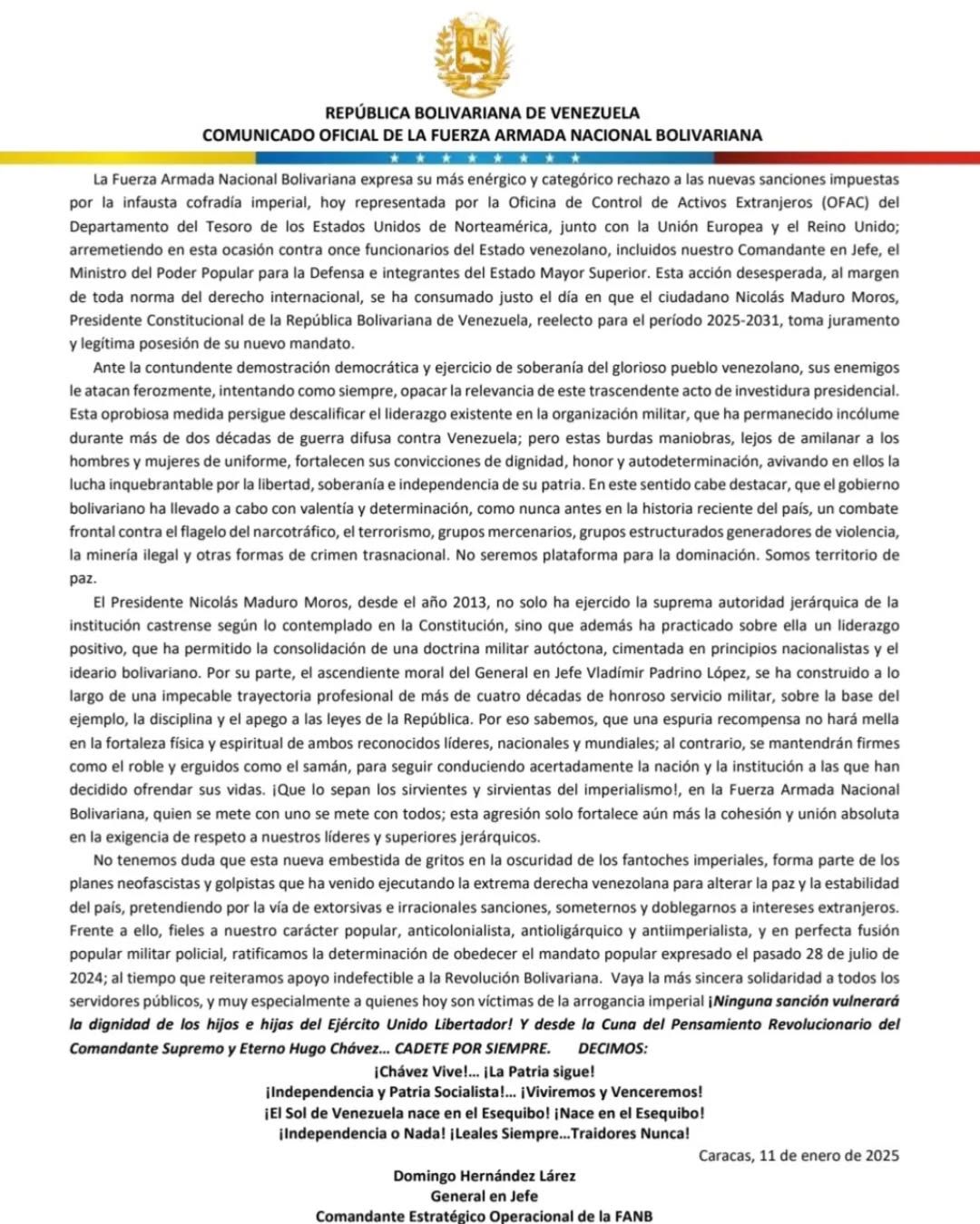 La Fuerza Armada Nacional Bolivariana (FANB) expresó este sábado su rechazo a la nueva ronda de sanciones impuestas contra el gobierno de Nicolás Maduro, por parte de Estados Unidos (EEUU), Reino Unido y la Unión Europea (UE); tras la juramentación del líder chavista para un nuevo período presidencial (2025-2031) este 10 de enero, a pesar de las serias dudas que existen en torno a su supuesta victoria el pasado 28 de julio.