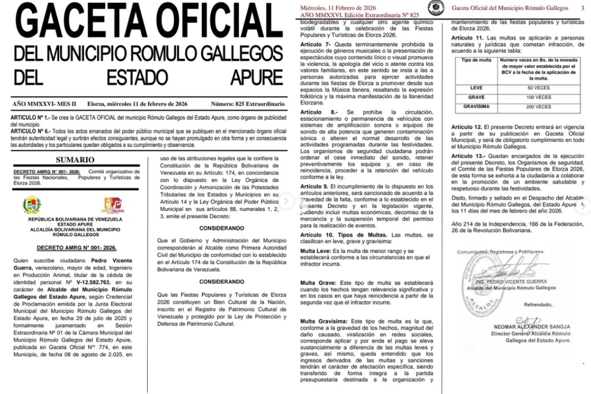 Las autoridades del municipio Rómulo Gallegos, en el estado Apure, establecieron una serie de normas y multas de cara a las Fiestas de Elorza, con el objetivo de evitar desórdenes o incidentes durante las celebraciones.