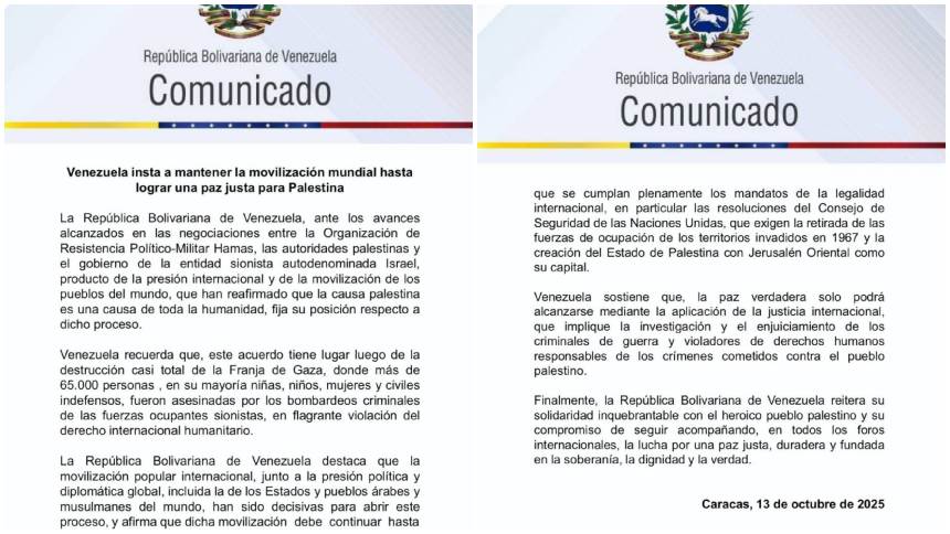 El gobierno de Maduro sostuvo que Venezuela reitera su «solidaridad inquebrantable con el pueblo palestino». Además, indicó que mantiene su compromiso de seguir acompañando «la lucha por una paz justa, duradera. Y fundada en la soberanía, la dignidad y la verdad».