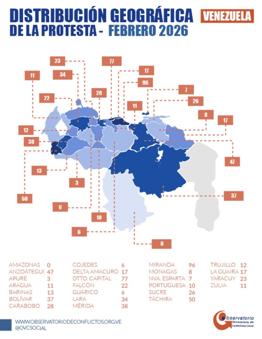 Las principales protestas se dieron en Miranda (96), Caracas (77), Táchira (50), Anzoátegui (47), Mérida (38), Bolívar (37), Lara (34), Carabobo (28), Sucre (26), Yaracuy (23), Falcón (22), La Guaira (17), Delta Amacuro (17), Trujillo (12) y Aragua (11).