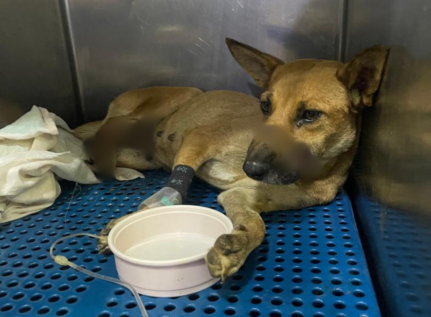 «El amarre hizo estragos y la perrita tiene una pata totalmente destrozada y la otra también, pero es más salvable. Y el hocico, aunque hay hueso expuesto y se comió parte de la boca como tal, la perra está comiendo», expuso Aponte.