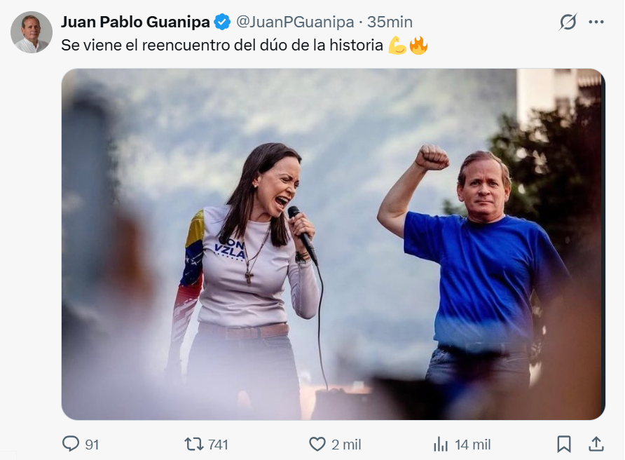A través de sus redes, Guanipa colocó una fotografía junto a la líder de la oposición, María Corina Machado, durante una actividad en Chacao en enero de 2025.