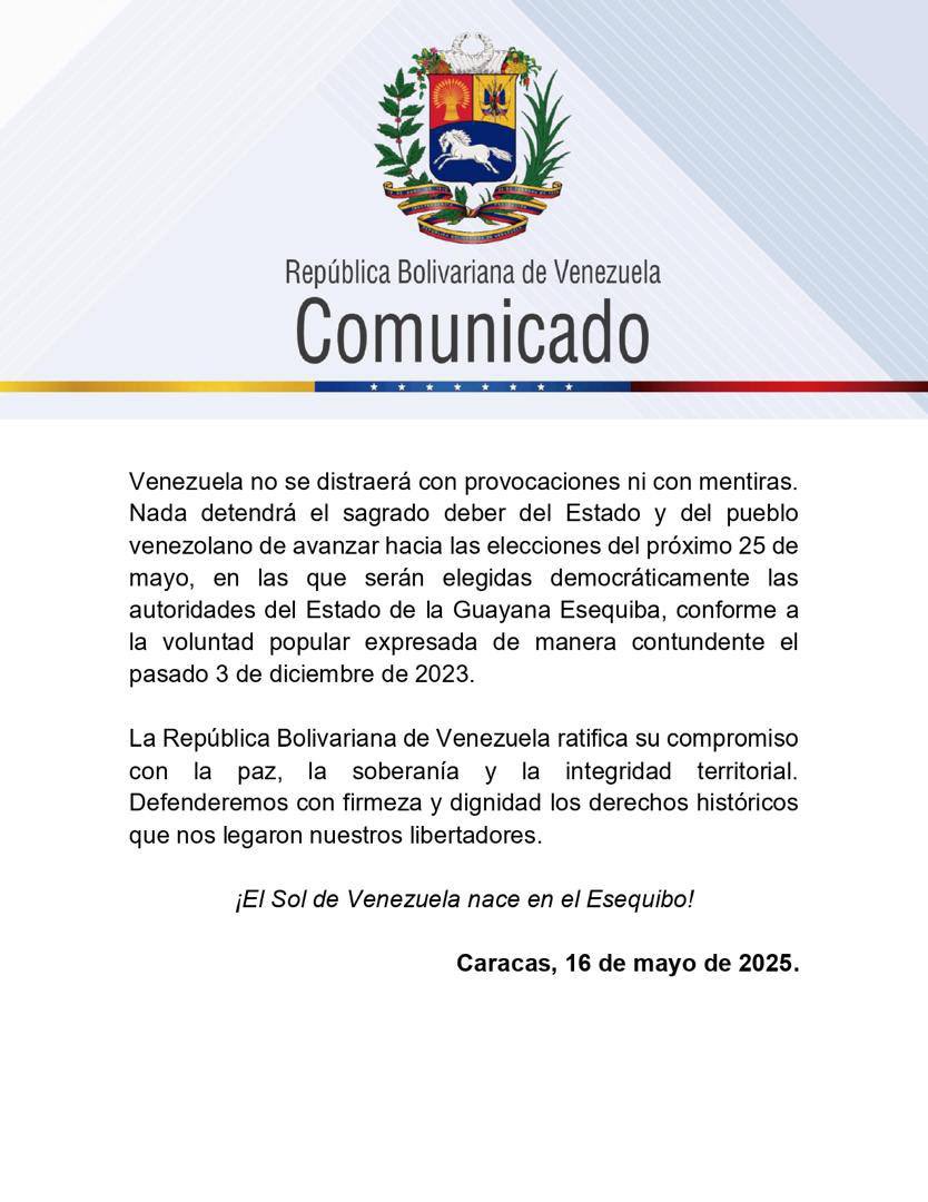 Por último, el comunicado de la cancillería reiteró que el próximo 25 de mayo se elegirán autoridades para el Esequibo, aunque extrañamente no habrá centros de votación en el territorio en cuestión, administrado actualmente por el gobierno de Guyana.