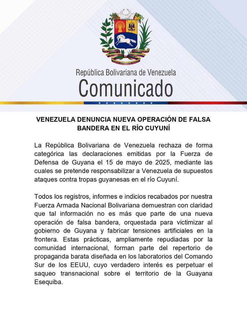 «La República Bolivariana de Venezuela rechaza de forma categórica las declaraciones emitidas por la Fuerza de Defensa de Guyana el 15 de mayo de 2025, mediante las cuales se pretende responsabilizar a Venezuela de supuestos ataques contra tropas guyanesas», aclaró la misiva.