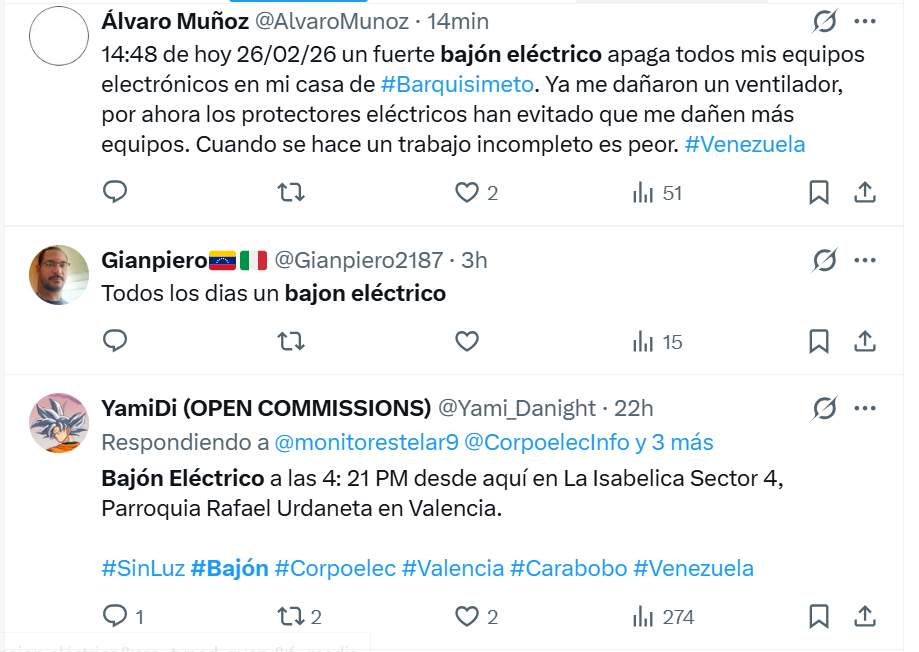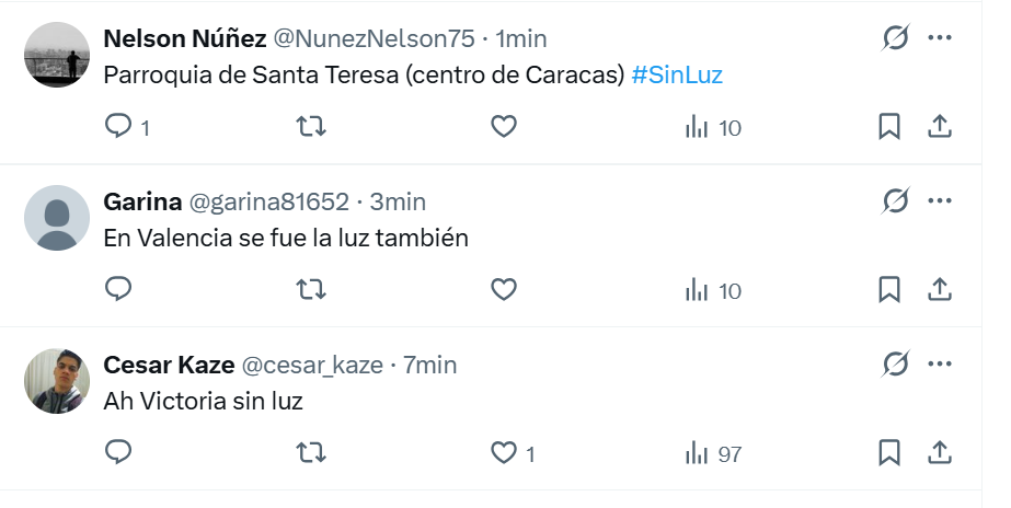De igual forma, internautas denunciaron que también hubo cortes del servicio en algunas zonas de Valencia, estado Carabobo, y de la carretera vieja hacia Los Teques, en el estado Miranda.