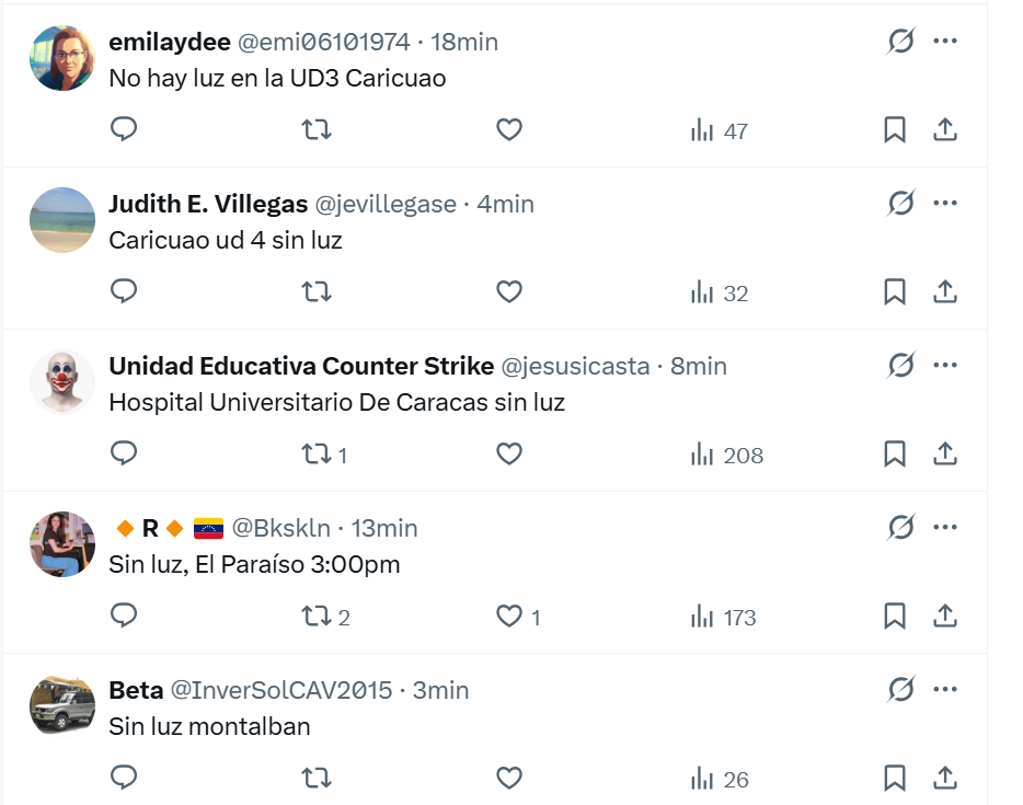 Reportes en redes sociales indican que «el apagón» afectó a sectores de Colinas de Santa Mónica, Cumbres de Curumo, El Paraíso, San Martín, Las Acacias, Los Chaguaramos, La Vega, Caricuao, Quinta Crespo, El Cementerio, Santa Teresa, Montalbán, Macarao, Colinas de Bello y varios puntos del centro de Caracas, entre otros.