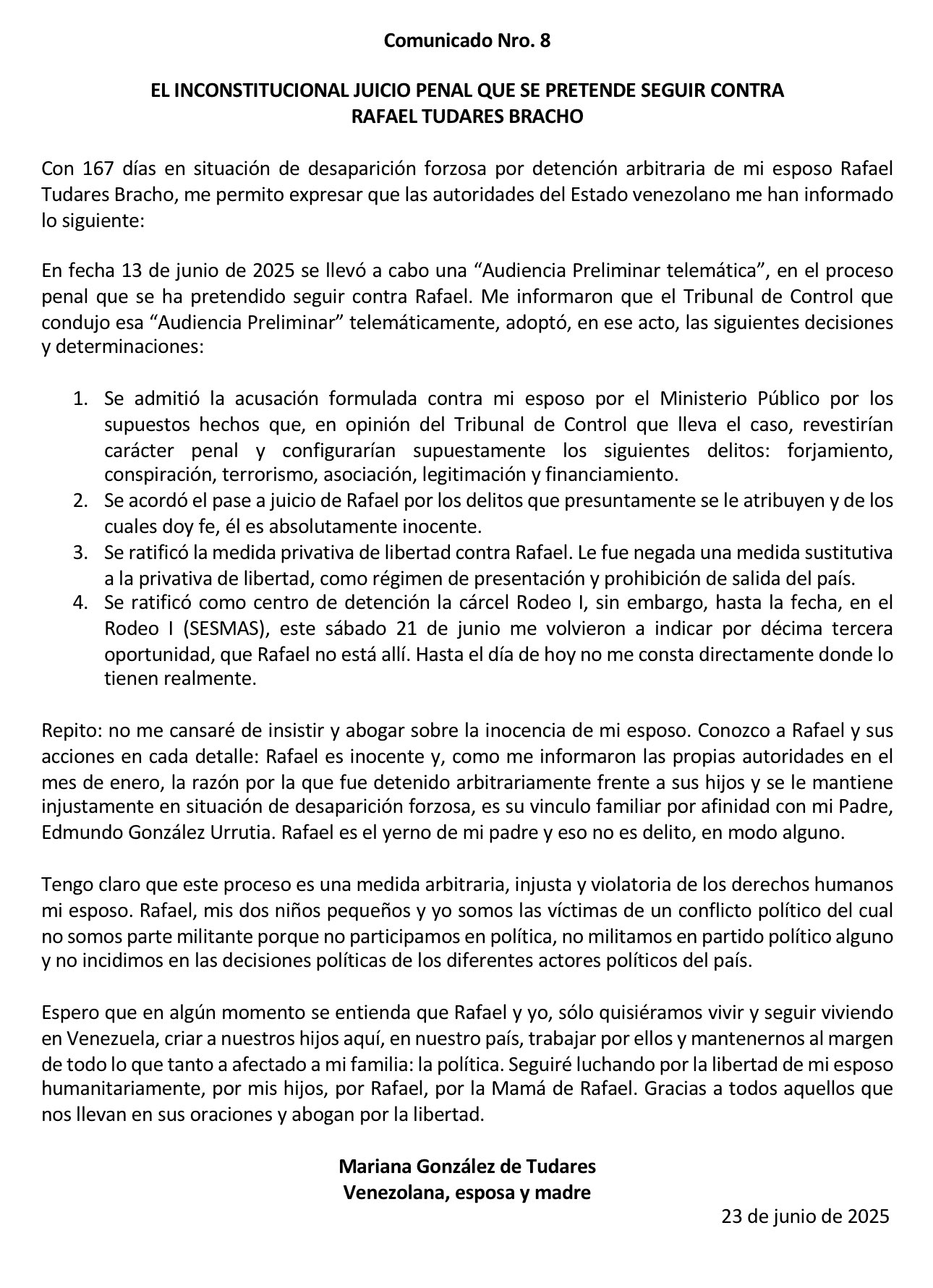 Mariana González, la esposa de Tudares, informó en sus redes sociales sobre los avances del caso. Aparentemente, el 13 de junio se llevó a cabo la «audiencia preliminar telemática» y el Tribunal de Control autorizó un juicio.