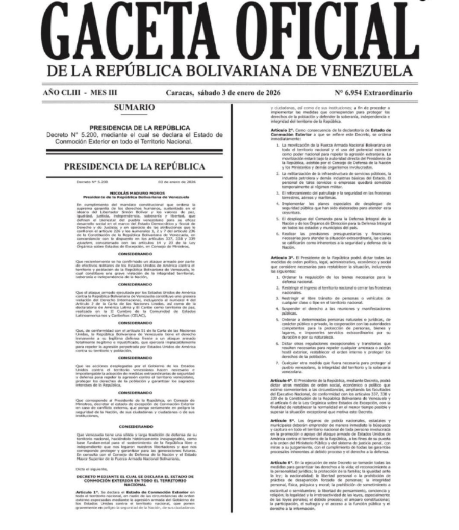 Rodríguez aseguró en la madrugada del sábado que Maduro firmó el documento, aunque fue detenido por Estados Unidos. Para el lunes, trascendieron los primeros detalles sobre lo establecido en el estado de conmoción externa.