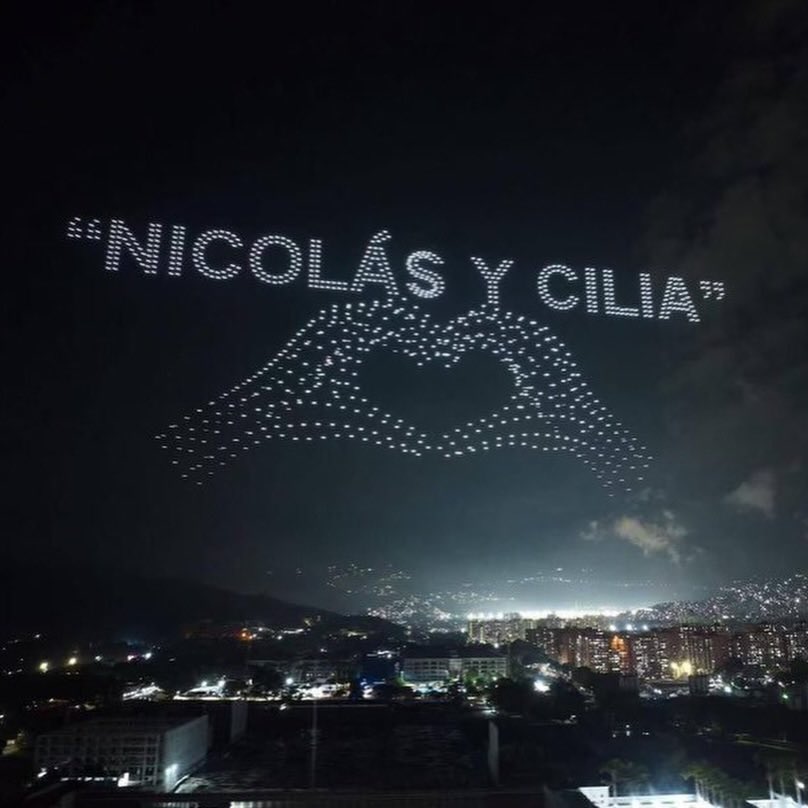 “Soy inocente, no soy culpable. Soy un hombre decente y el presidente constitucional de mi país”, rezaba uno de los mensajes proyectados en el firmamento. La frase citaba las palabras que Maduro pronunció ante un juez en Nueva York después de su detención. Además, en otro pasaje, los drones hicieron una formación para presentar las imágenes de Maduro y Flores.