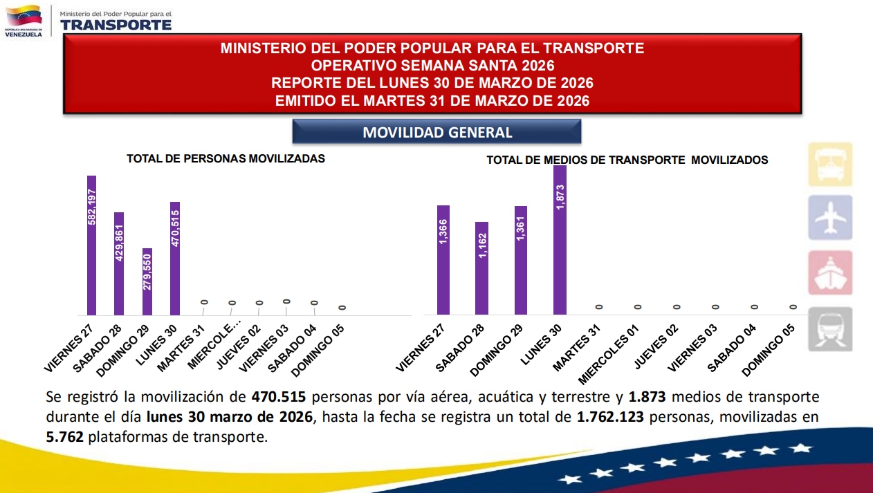 Igualmente, el Ministerio de Transporte subrayó que miles de funcionarios se mantienen desplegados en esta Semana Santa. Asimismo, habría medios y vehículos disponibles para atender las posibles contingencias.
