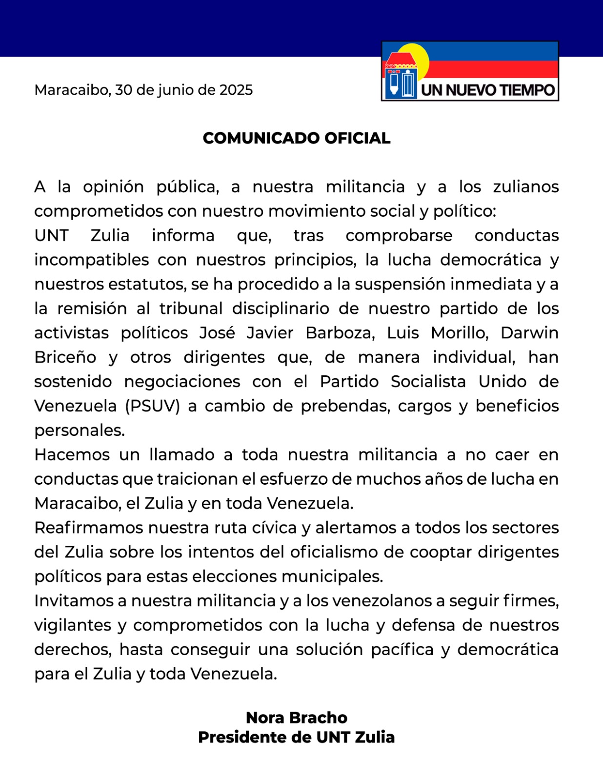 «Hacemos un llamado a toda nuestra militancia a no caer en conductas que traicionan el esfuerzo de muchos años de lucha en Maracaibo, el Zulia y en toda Venezuela. Reafirmamos nuestra ruta cívica y alertamos a todos los sectores del Zulia sobre los intentos del oficialismo de cooptar dirigentes políticos para estas elecciones municipales», expresó UNT.