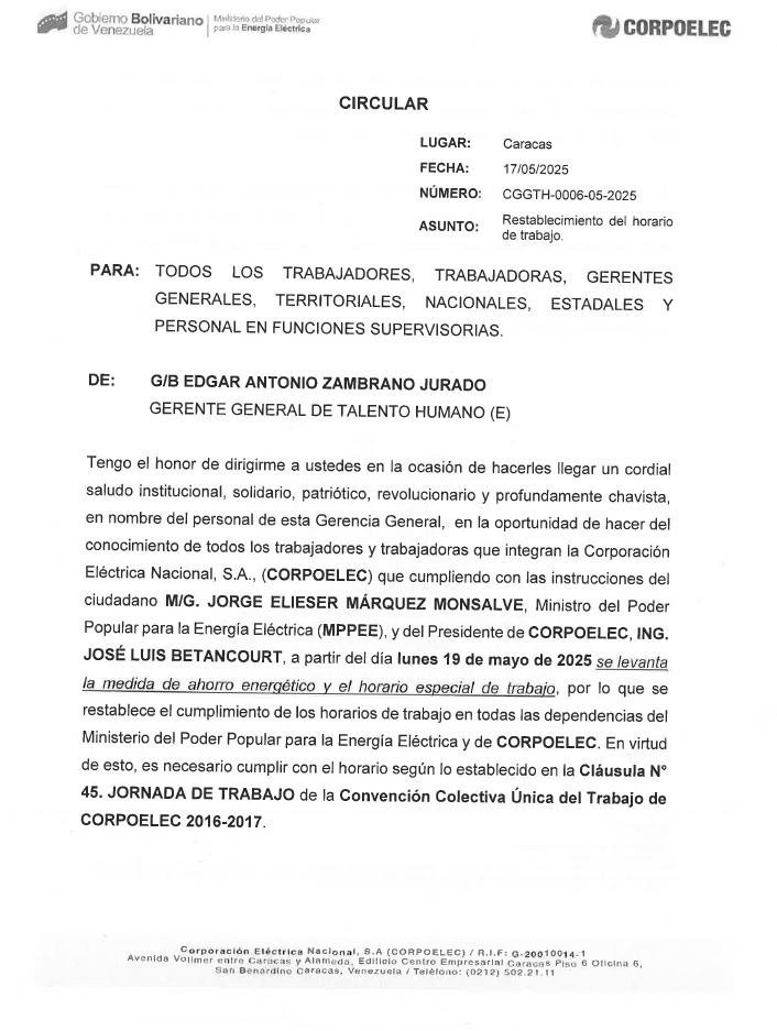 «Se levanta la medida de ahorro energético y el horario especial de trabajo, por lo que se restablece el cumplimiento de los horarios de trabajo en todas las dependencias del Ministerio del Poder Popular para la Energía Eléctrica y de Corpoelec», indicó el texto.