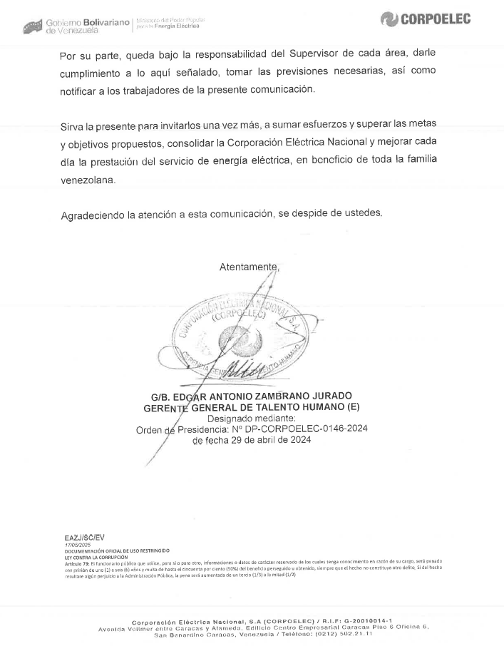 En la circular destacan que la orden fue dada por el ministro para la Energía Eléctrica, Jorge Elieser Márques Monsalve, y José Luis Betancourt, presidente de Corpoelec.