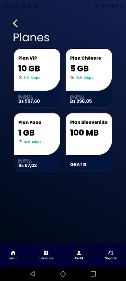 El plan más económico tiene en la actualidad un costo de 67,02 bolívares por 1 GB de navegación a una velocidad de 10 Mbps. El siguiente plan tiene un costo de 298,85 bolívares oir 5GB de navegación a una velocidad de 10 Mbps. Finalmente, el plan más costo puede adquirirse por 597,60 bolívares y da acceso a 10 GB de navegación a una velocidad de 5Mbps.